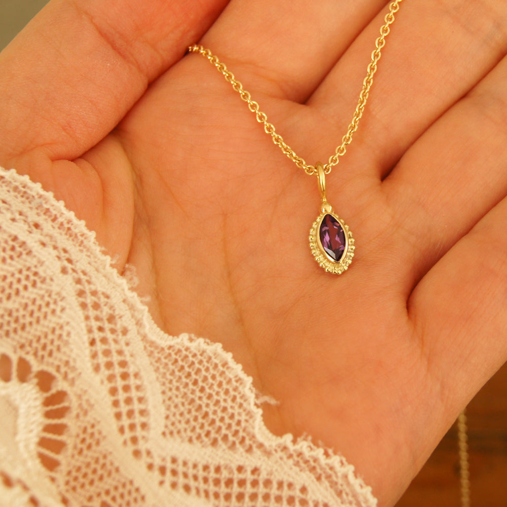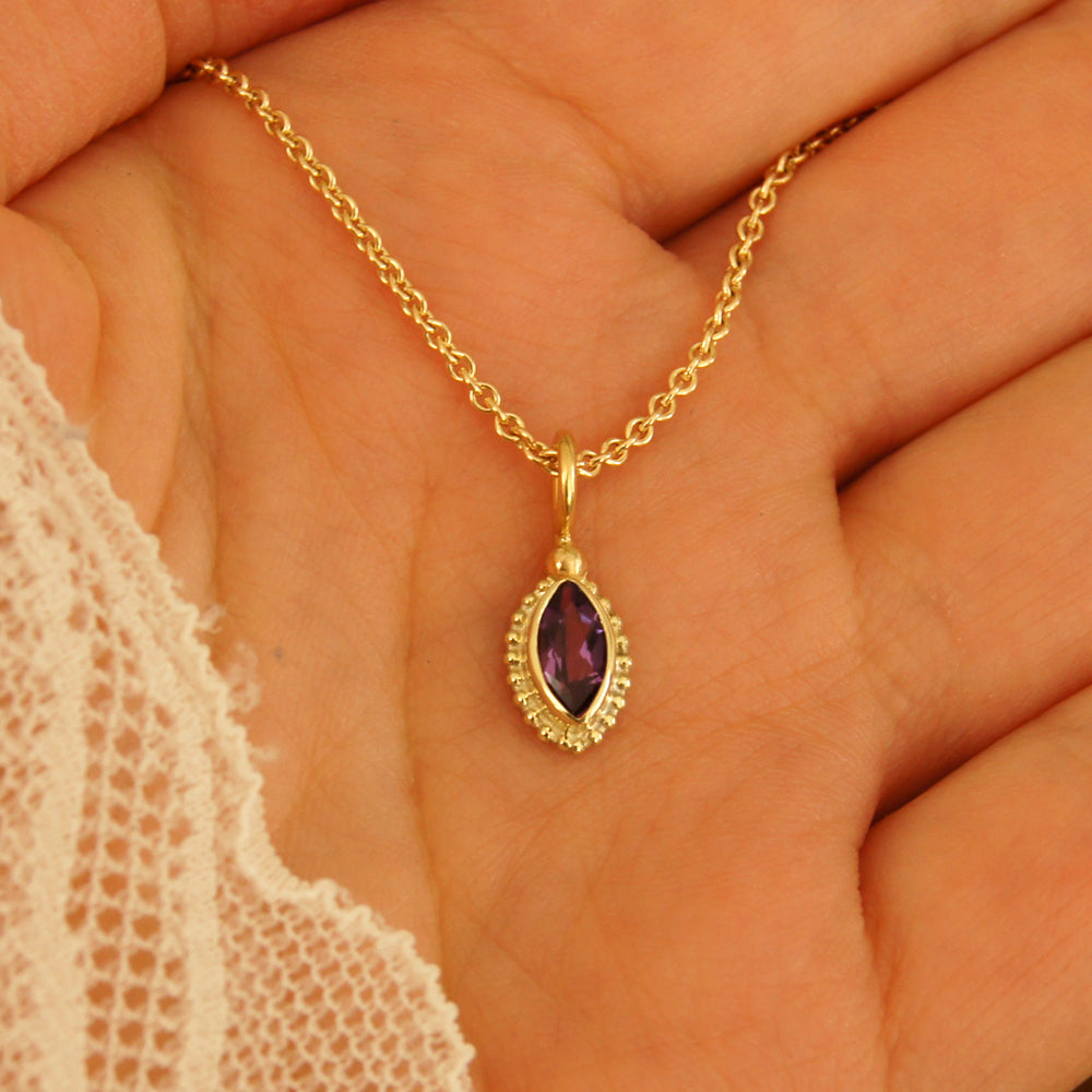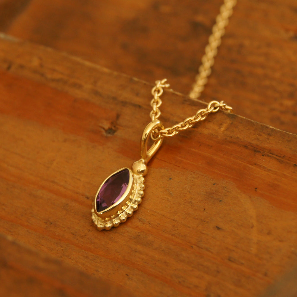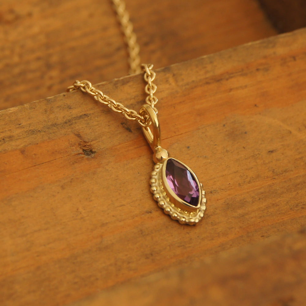 Unieke hanger met markiesvormige amethist met bolletjesrand in geelgoud