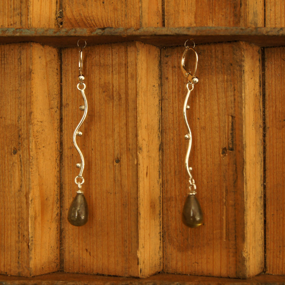 De druppelvormige labradoriet maakt deze oorhangers helemaal af.